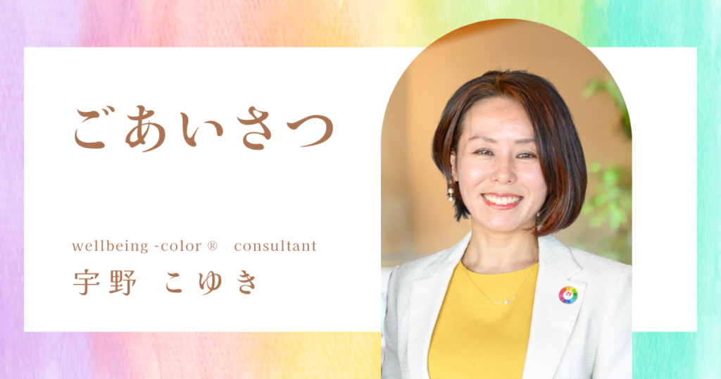 はじめまして。ウェルビーイングカラーコンサルタント の宇野こゆきです。